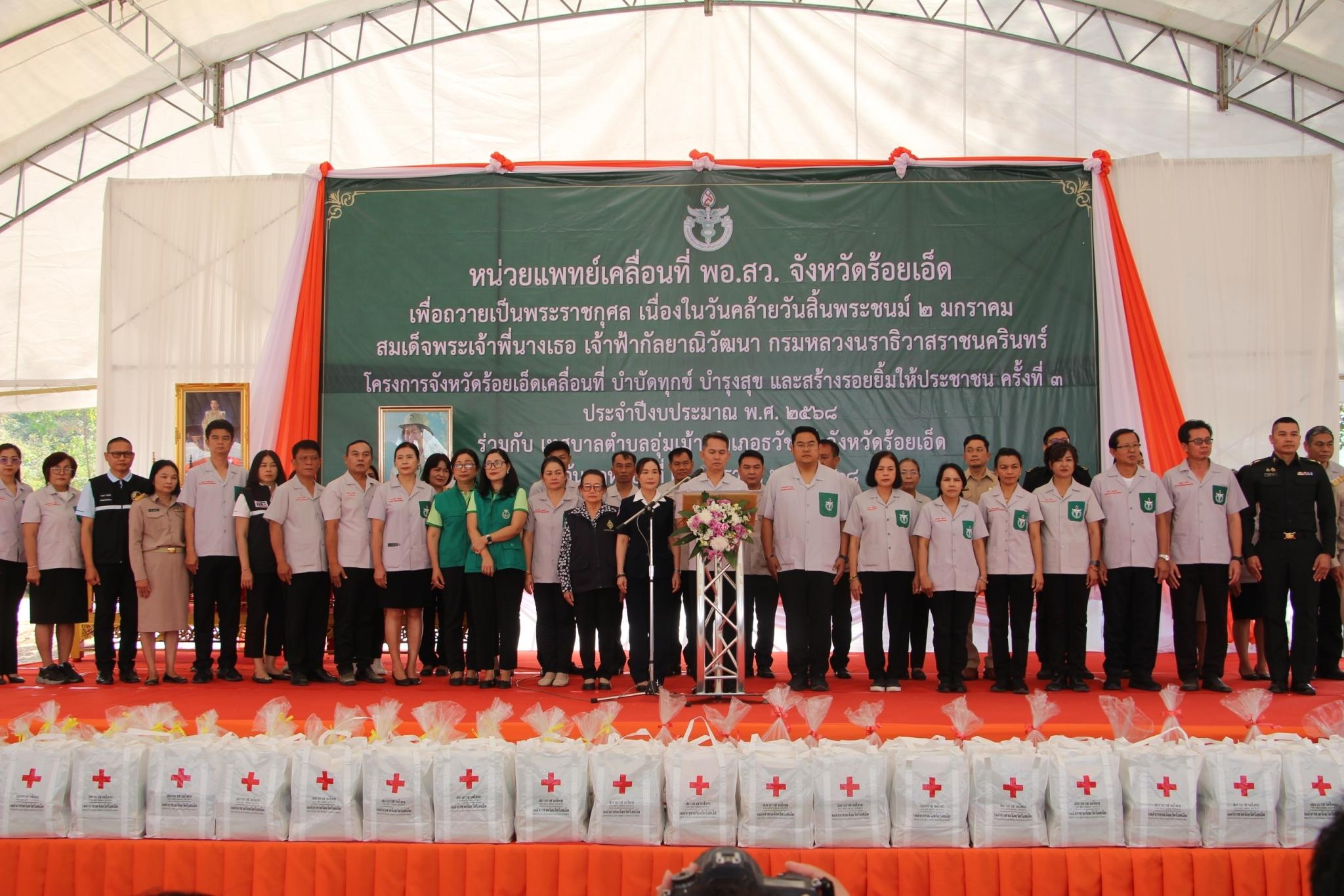 จังหวัดร้อยเอ็ดได้จัดกิจกรรมโครงการจังหวัดร้อยเอ็ดเคลื่อนที่ บำบัดทุกข์ บำรุงสุข และสร้างรอยยิ้ม ให้ประชาชน ครั้งที่ 3 ประจำปีงบประมาณ พ.ศ.2568 ร่วมกับหน่วยแพทย์อาสา สมเด็จพระศรีนครินทร์ทราบรมราชชนนี (พอ.สว.) ในวันพฤหัสบดีที่ 23 มกราคม 2568 โดยมี นายสุวัฒน์ เข็มเพชร รองผู้ว่าราชการจังหวัดร้อยเอ็ด เป็นประธานในพิธี การออกหน่วยบริการจังหวัดเคลื่อนที่ บำบัดทุกข์ บำรุงสุข และสร้างรอยยิ้มให้ประชาชน ณ โรงเรียนขี้เหล็กเขียวไพรวัลย์ ตำบลอุ่มเม้า อำเภอธวัชบุรี จังหวัดร้อยเอ็ด ศูนย์แสดงและจำหน่ายสินค้าพื้นเมือง หนึ่งตำบล หนึ่งผลิตภัณฑ์ กองสวัสดิการสังคม องค์การบริหารส่วนจังหวัดร้อยเอ็ด ได้นำสินค้าโอทอปไปจัดแสดงและจำหน่ายให้กับประชาชนที่มาร่วมกิจกรรม